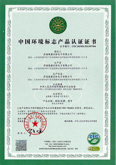 公司通過了CCC認證、節能認證、環境標誌產品認證、公安部安全與警用電子產品質量檢測中心檢測報告(CNAS認證) 、ISO9001、14001、18001、CE、CB、FCC、ROHS、抗震防塵等多項資質認證,並入選《政采節能產品清單》。